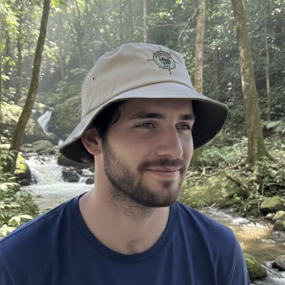 | Chapéu Bucket Bege logo Viajantes App - essa é a logo do app |